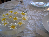 I went for a simple tropical-scented all-white theme. Plain white tablecloth (I made it from sheeting at Spotlight) covered with a beautiful cutwork tablecloth that was a gift last year. White cotton napkins with lace detail and plain silver cutlery with white plates. In the centre I put a wide glass bowl (Spotlight, about $25) filled with water. I went down early Christmas morning to the frangipani tree in the yard to collect some perfect floral specimens, which floated nicely in the bowl. Champagne flutes from Wheel and Barrow and white chair covers, borrowed. So peaceful, so pretty. I was very happy with the result.